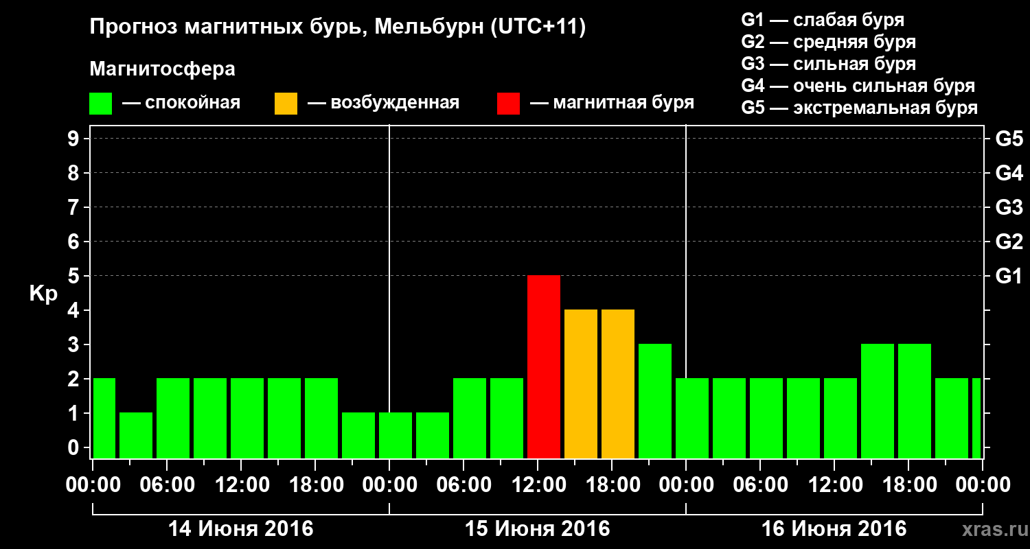 Прогноз магнитных бурь в Мельбурне — 14 июня 2016 года