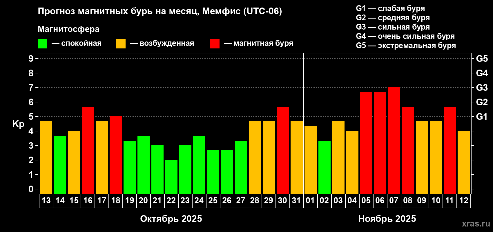 Прогноз магнитных бурь в Мемфисе — 13 октября 2025 года
