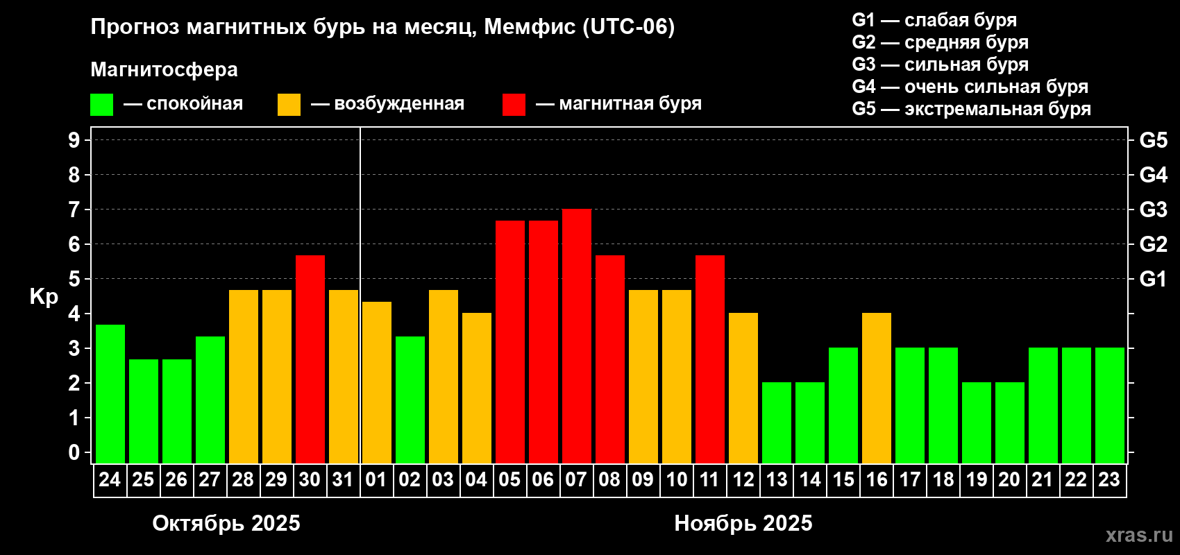 Прогноз магнитных бурь в Мемфисе на 24 октября 2025 года