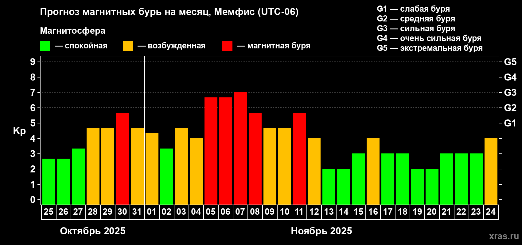 Прогноз магнитных бурь в Мемфисе на 25 октября 2025 года