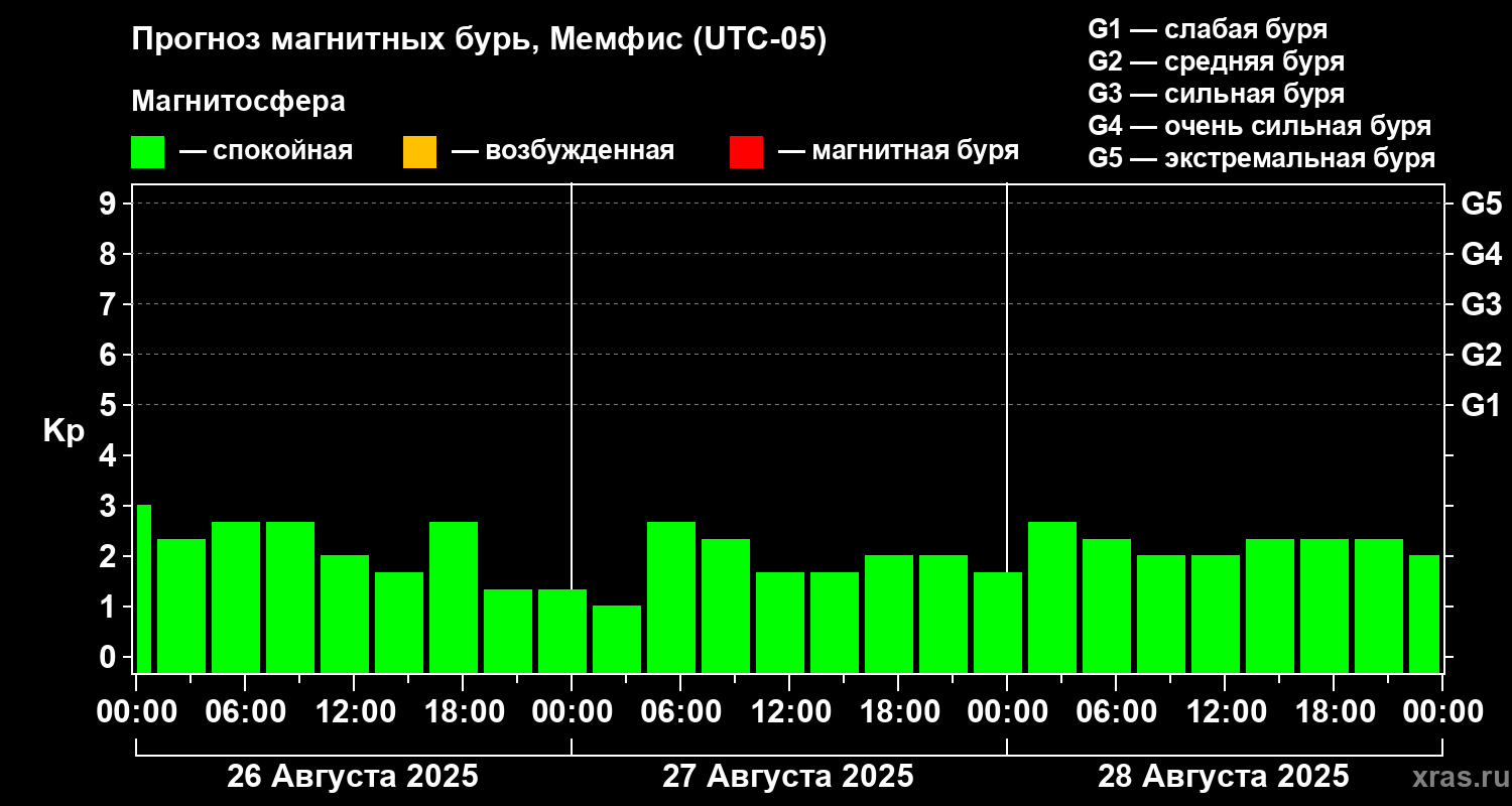Прогноз магнитных бурь в Мемфисе на 26 августа 2025 года