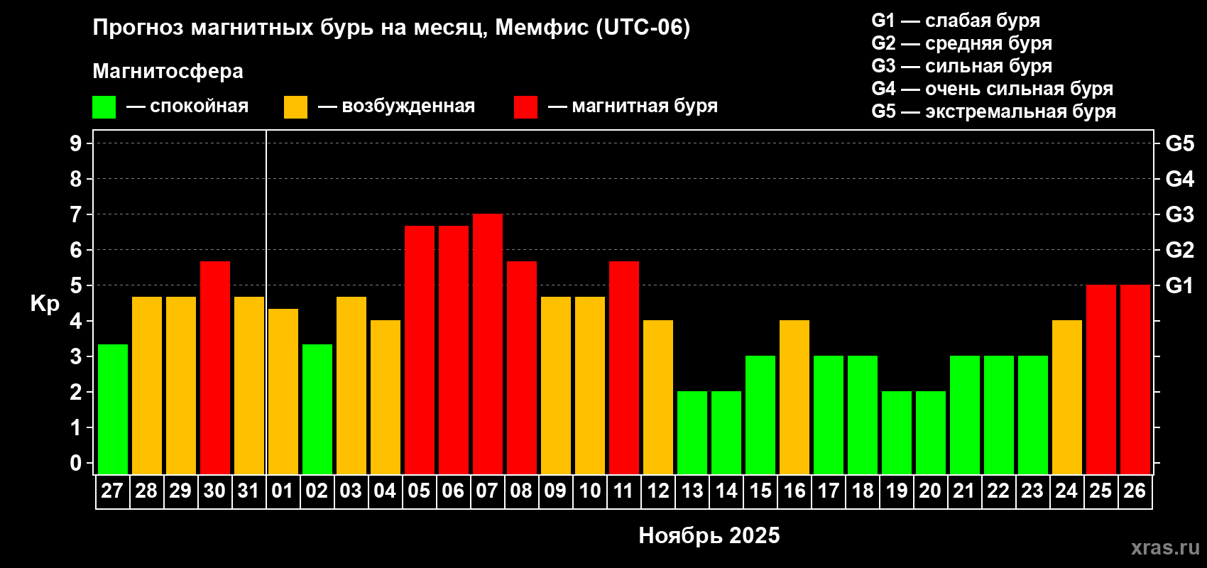 Прогноз магнитных бурь в Мемфисе на 27 октября 2025 года