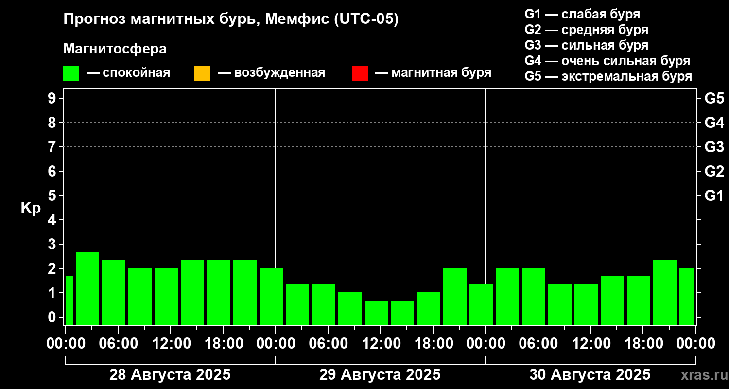 Прогноз магнитных бурь в Мемфисе на 28 августа 2025 года
