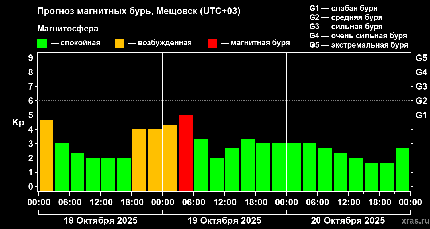 Прогноз магнитных бурь в Мещовске — 18 октября 2025 года
