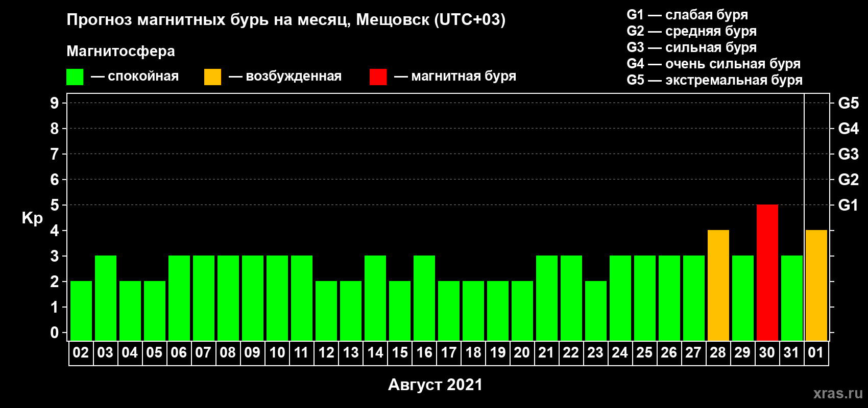 Прогноз магнитных бурь в Мещовске на 2 августа 2021 года