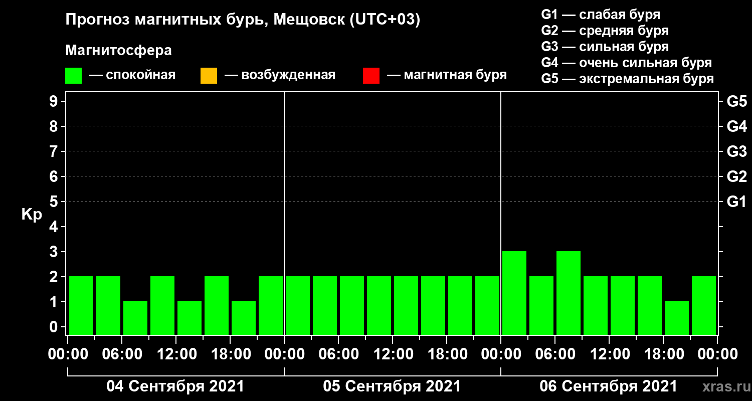 Прогноз магнитных бурь в Мещовске на 4 сентября 2021 года