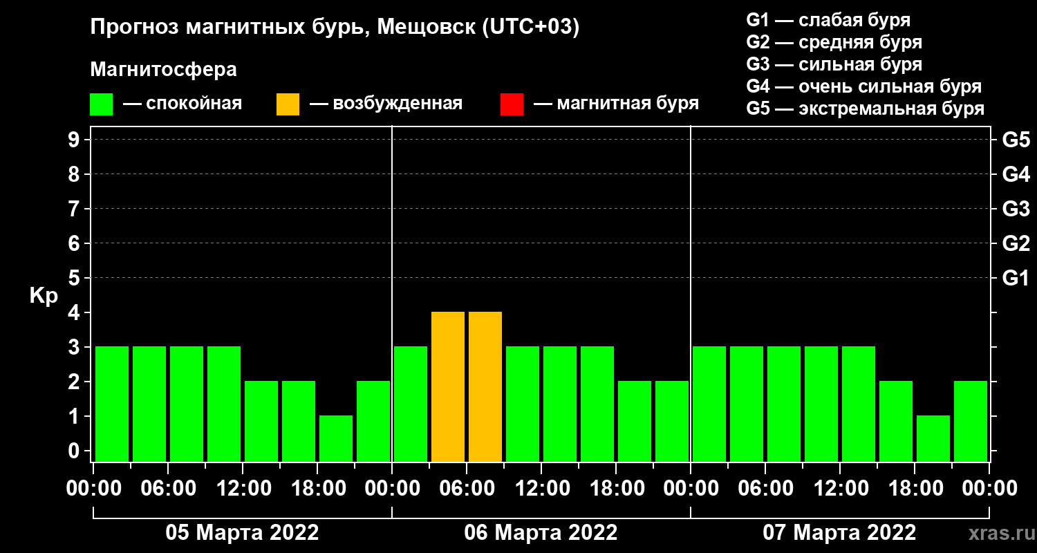 Прогноз магнитных бурь в Мещовске на 5 марта 2022 года