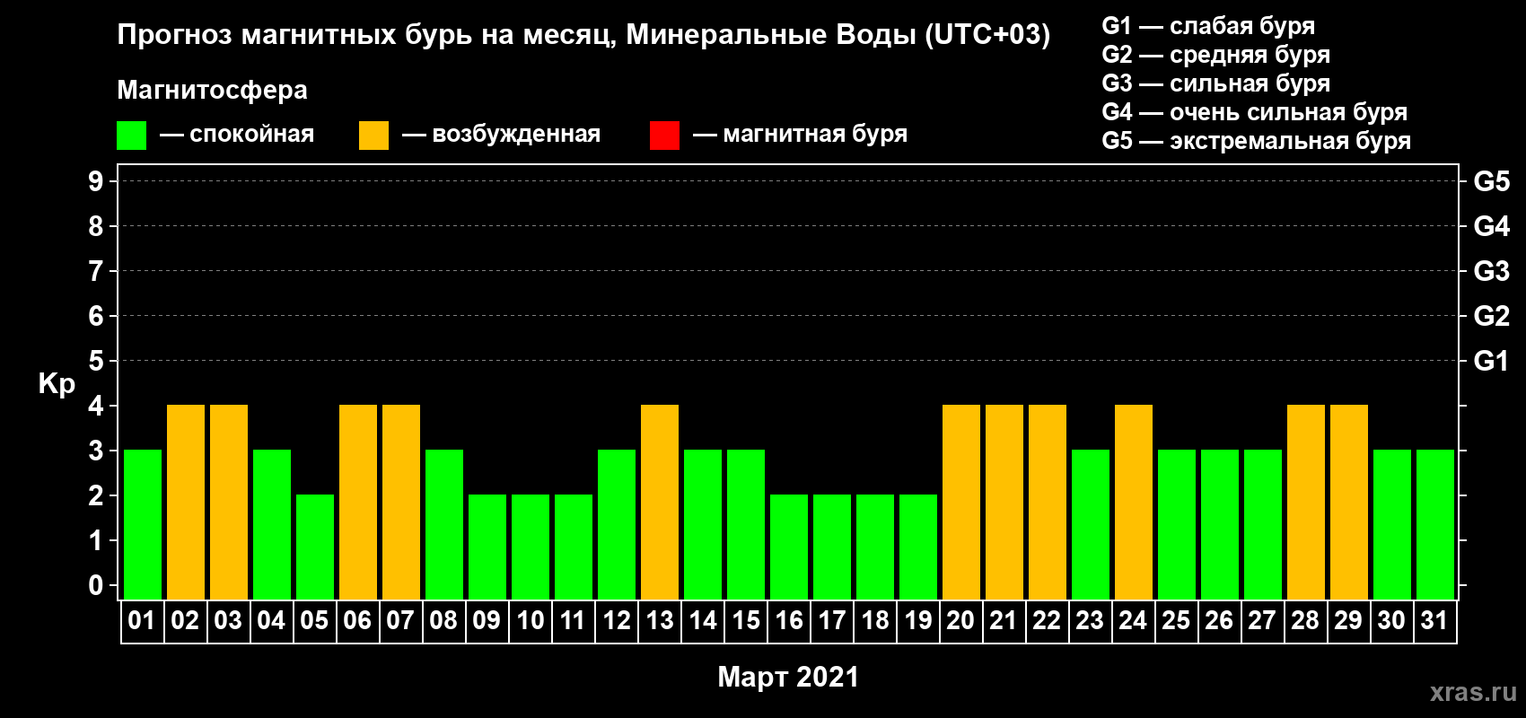 Прогноз максимального суточного геомагнитного индекса Kp на 1 месяц (31 день) с 01 марта по 31 марта 2021 г