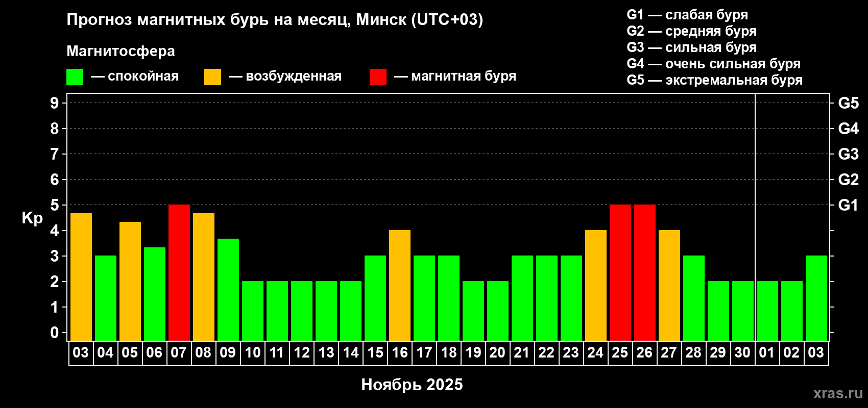 Прогноз магнитных бурь в Минске — 3 ноября 2025 года