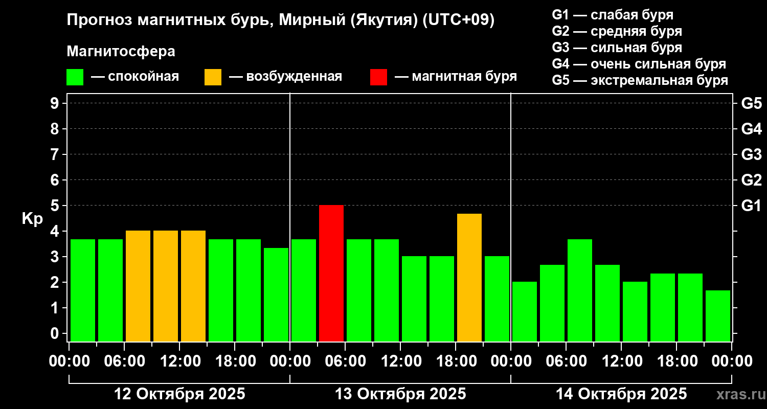Прогноз магнитных бурь Мирном (Якутия) — 12 октября 2025 года