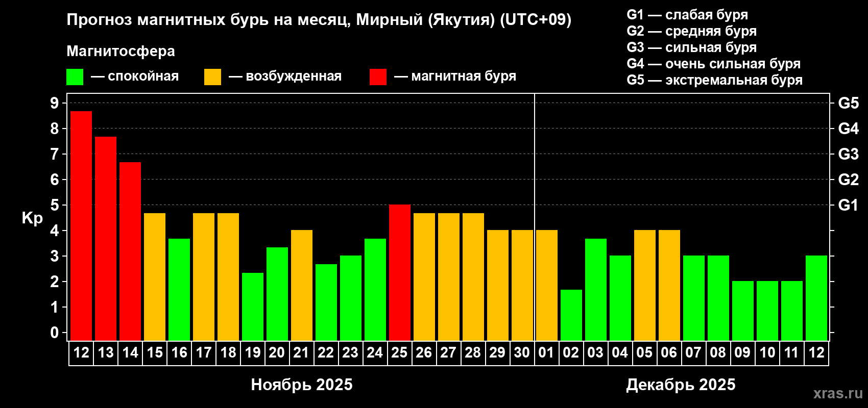 Прогноз магнитных бурь Мирном (Якутия) — 12 ноября 2025 года