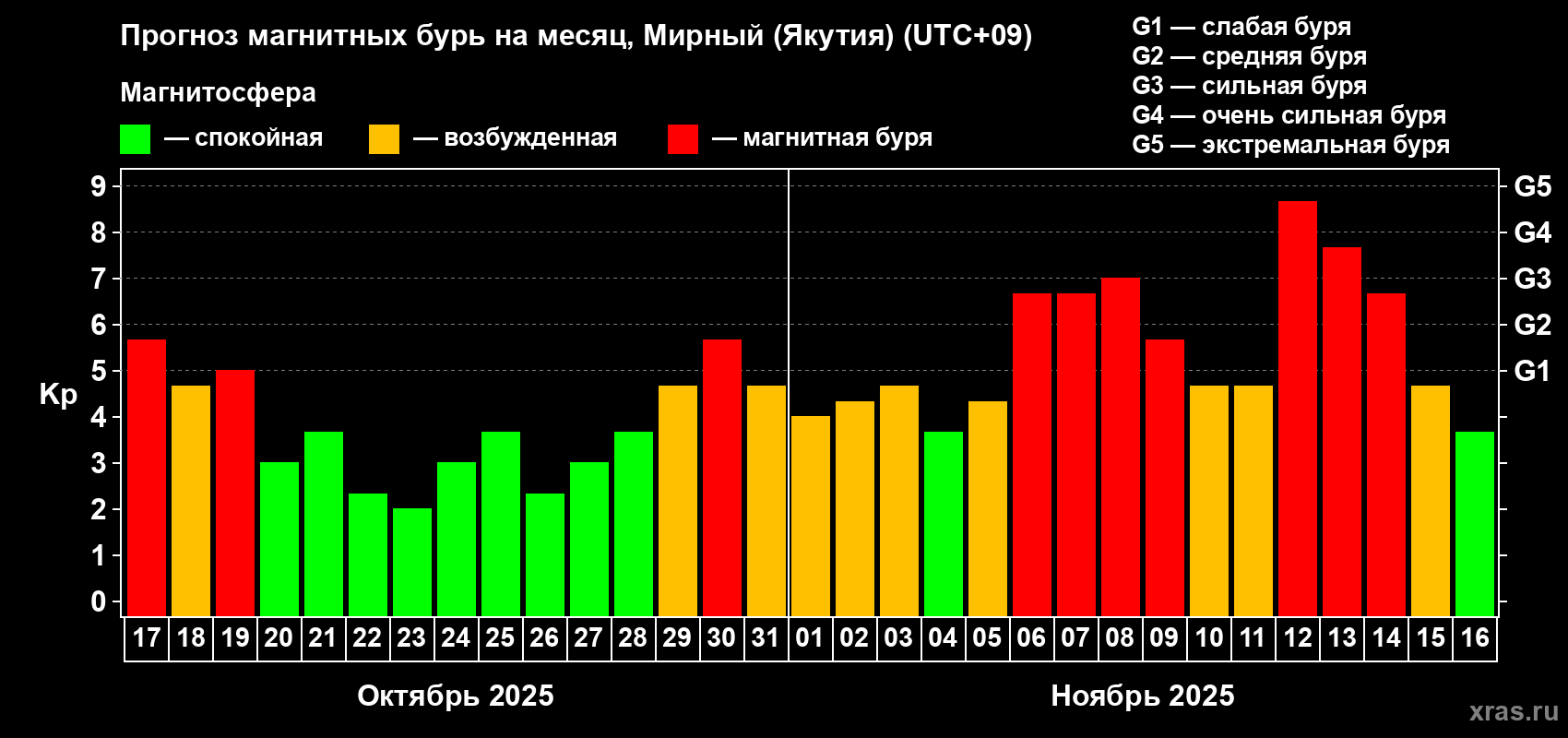 Прогноз магнитных бурь Мирном (Якутия) на 17 октября 2025 года