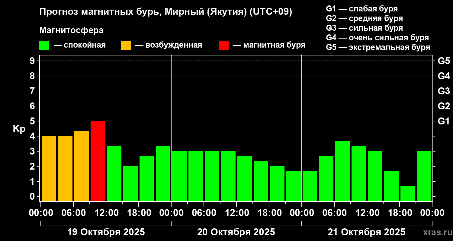 Прогноз магнитных бурь Мирном (Якутия) — 19 октября 2025 года