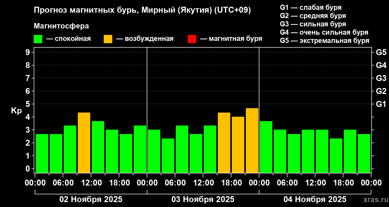 Прогноз магнитных бурь Мирном (Якутия) — 2 ноября 2025 года