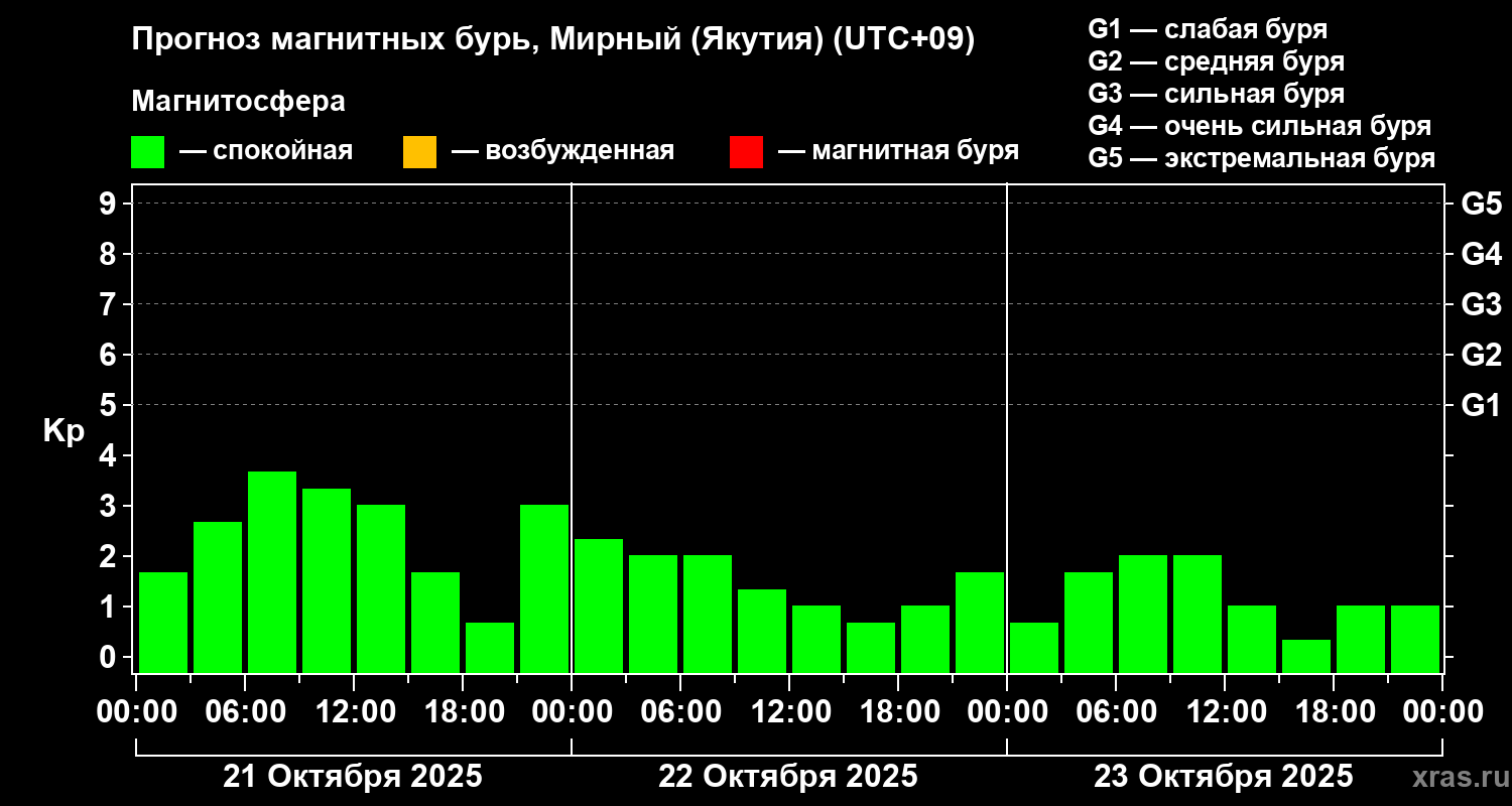 Прогноз магнитных бурь Мирном (Якутия) — 21 октября 2025 года