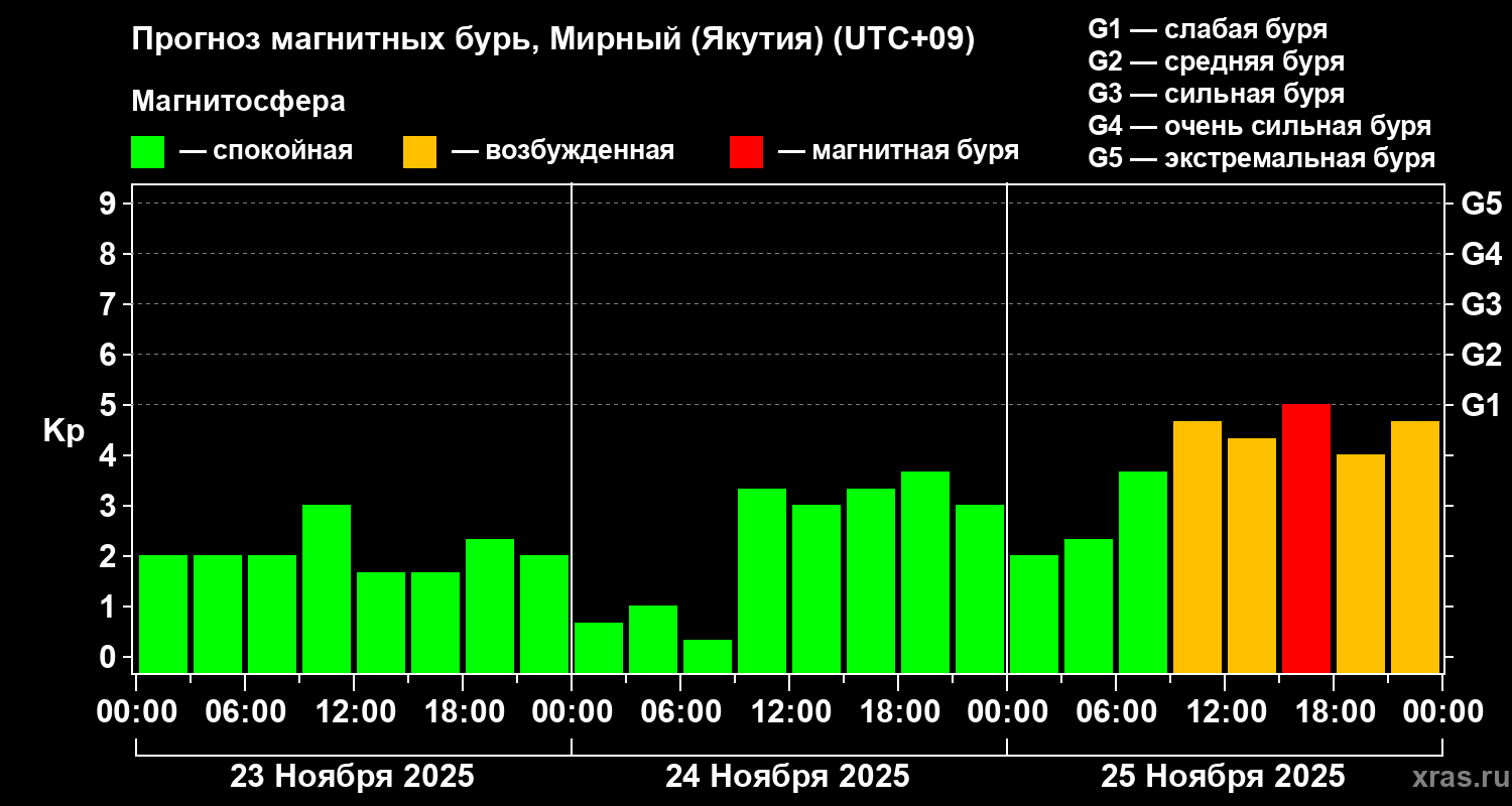 Прогноз магнитных бурь Мирном (Якутия) — 23 ноября 2025 года