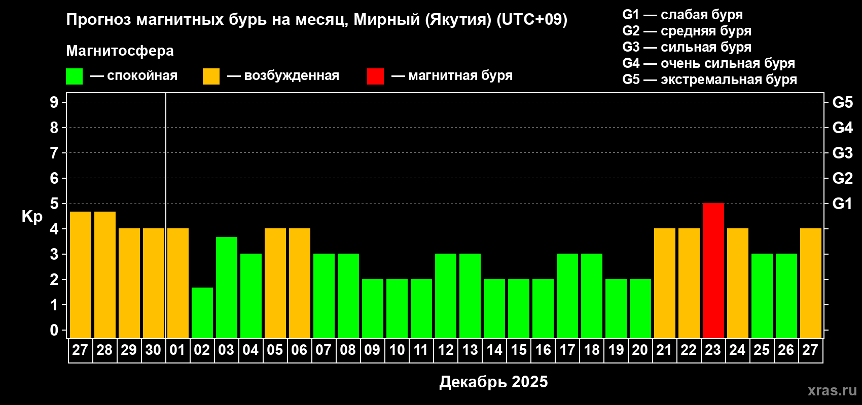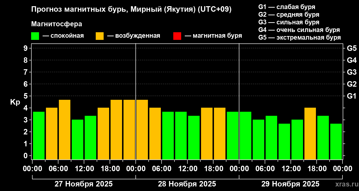 Прогноз магнитных бурь Мирном (Якутия) — 27 ноября 2025 года