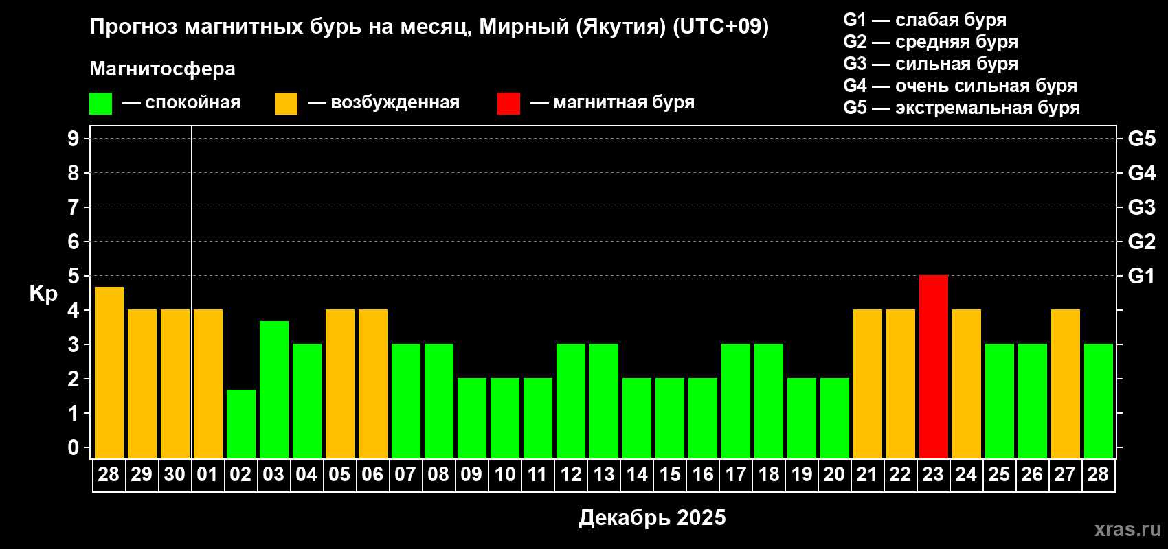 Прогноз магнитных бурь Мирном (Якутия) — 28 ноября 2025 года