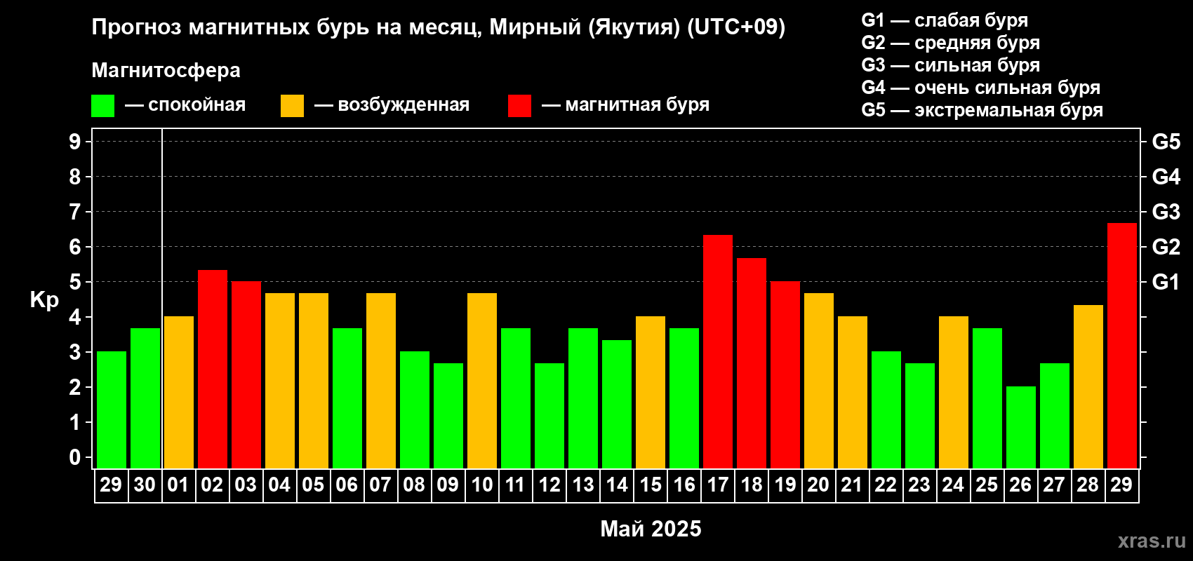 Прогноз магнитных бурь Мирном (Якутия) — 29 апреля 2025 года