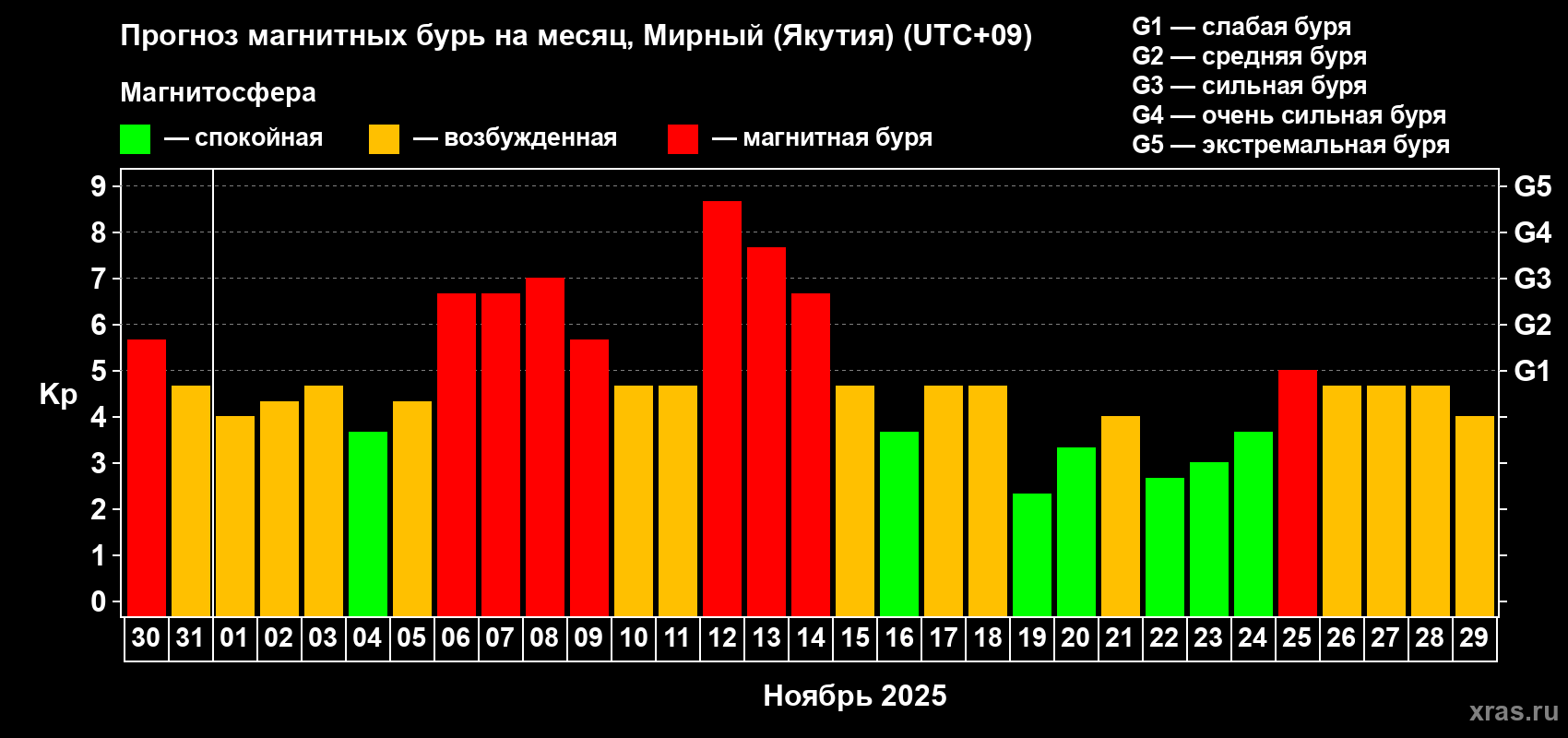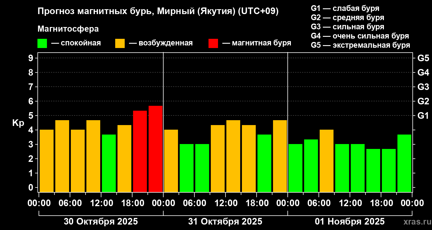 Прогноз магнитных бурь Мирном (Якутия) на 30 октября 2025 года