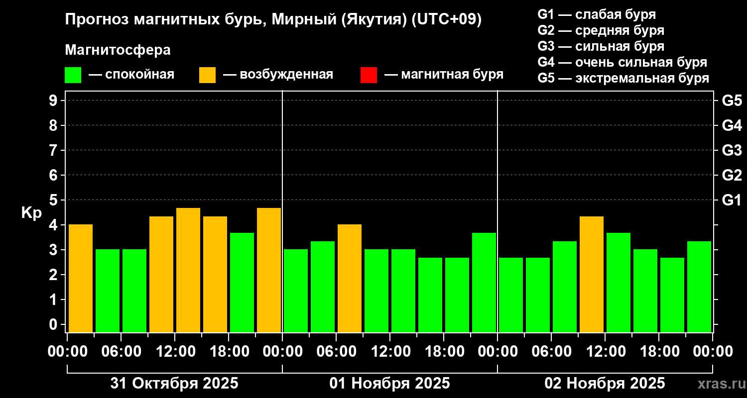 Прогноз магнитных бурь Мирном (Якутия) — 31 октября 2025 года