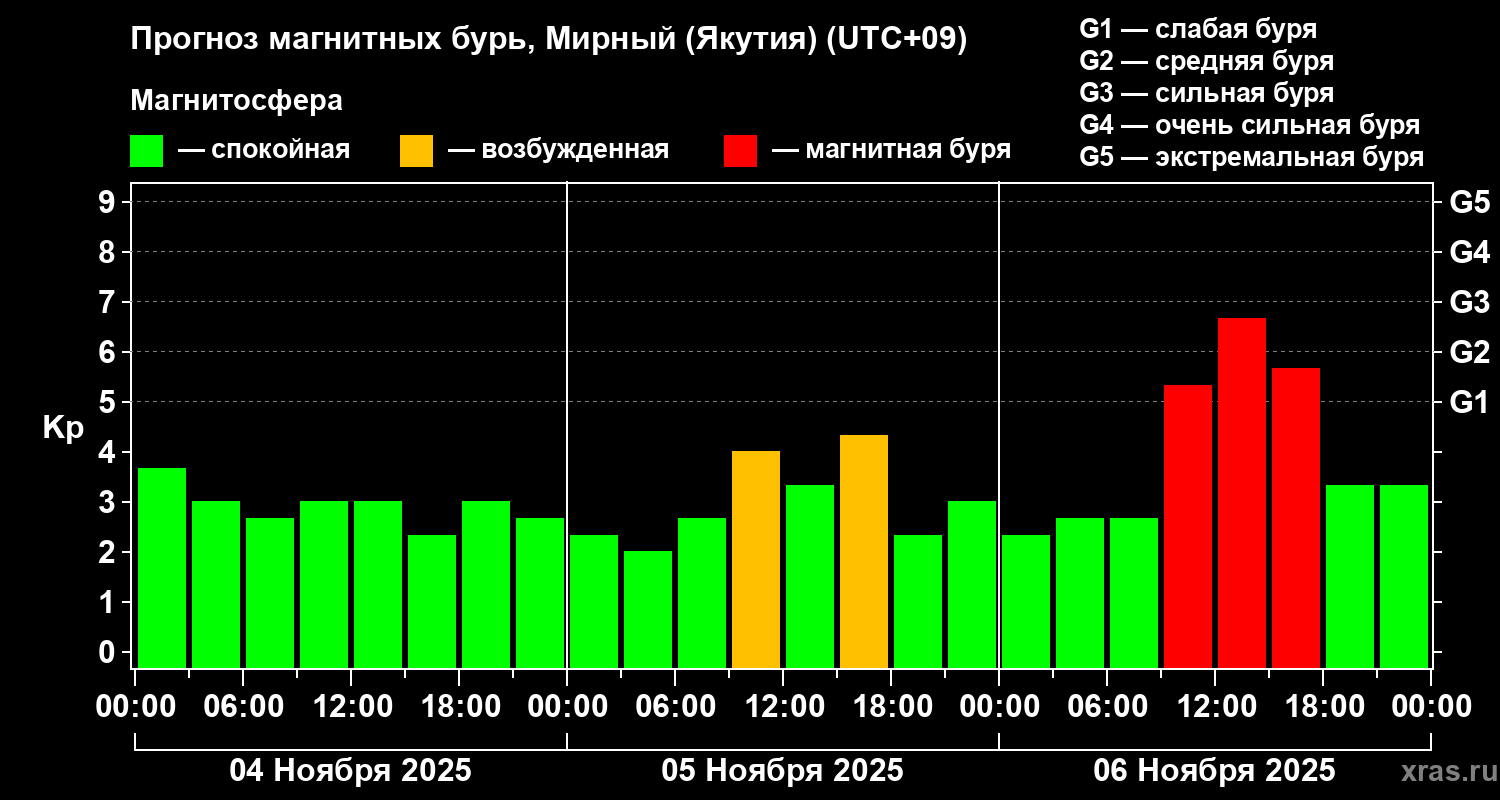 Прогноз магнитных бурь Мирном (Якутия) — 4 ноября 2025 года