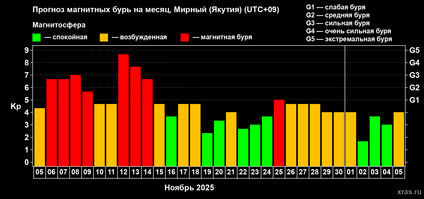 Прогноз магнитных бурь Мирном (Якутия) — 5 ноября 2025 года