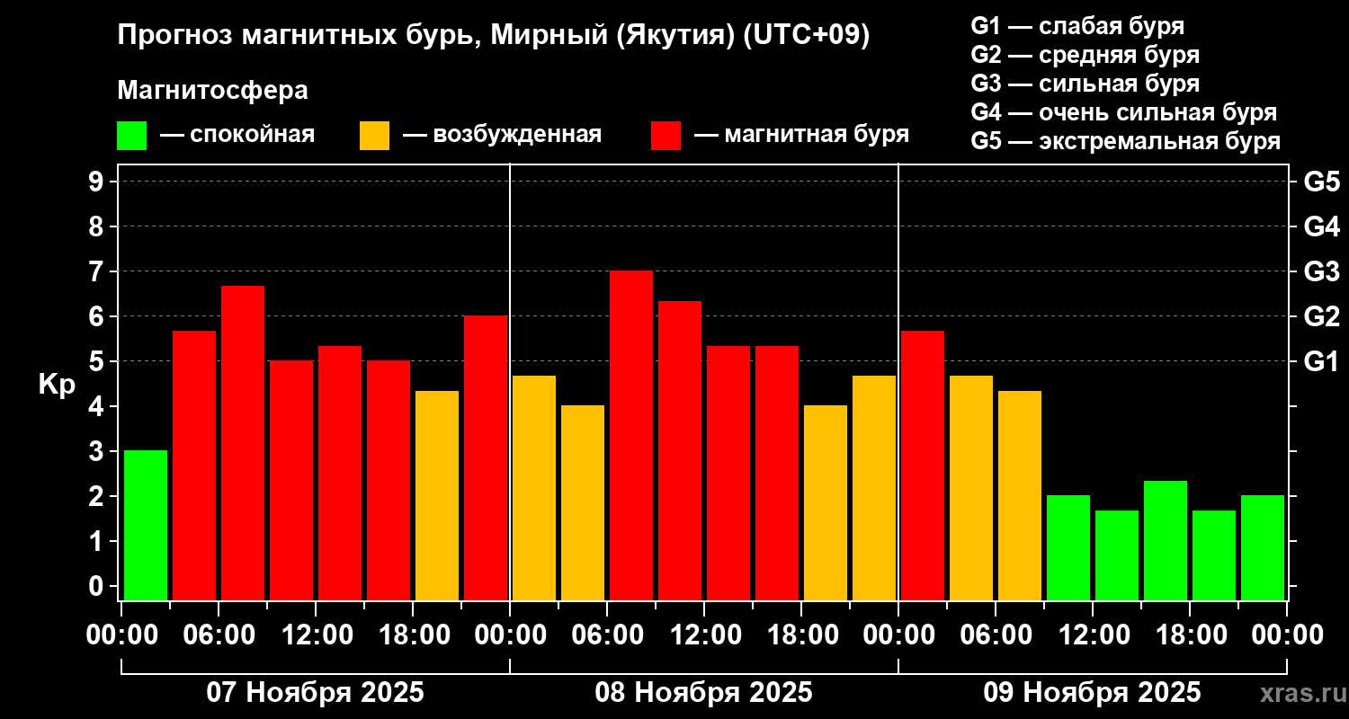 Прогноз магнитных бурь Мирном (Якутия) — 7 ноября 2025 года