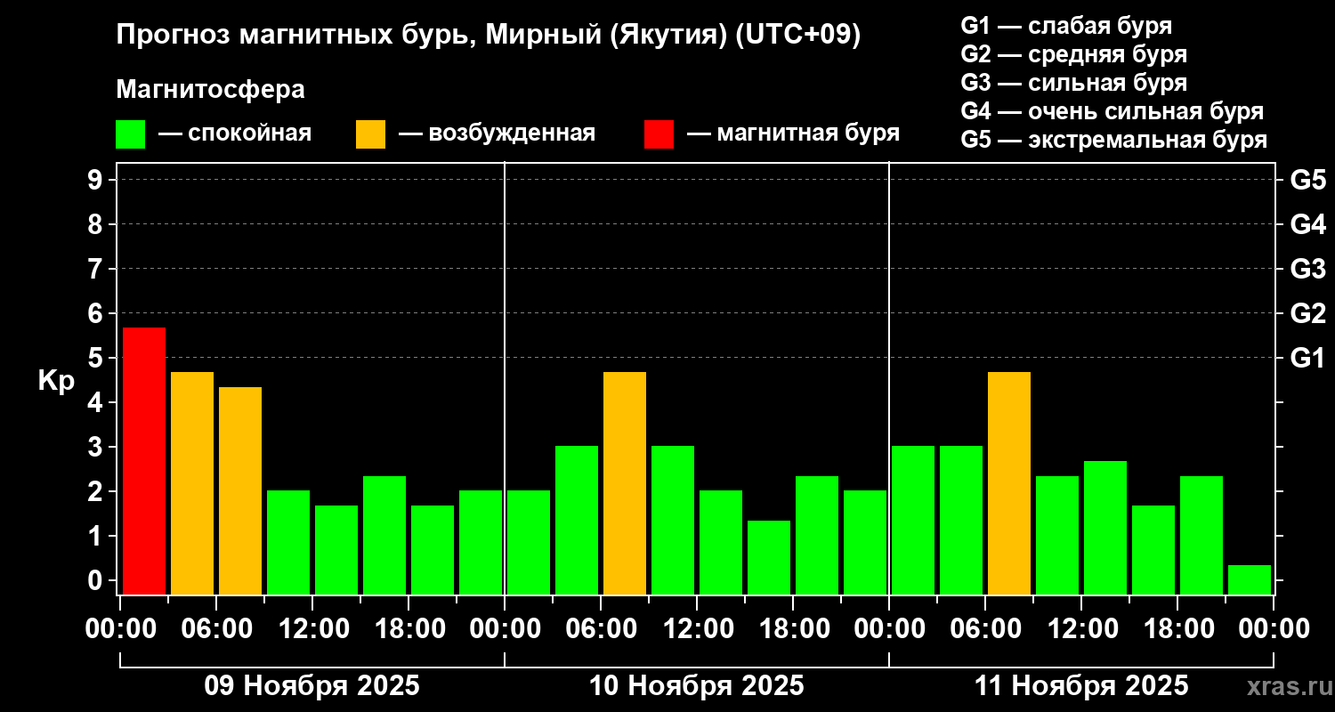 Прогноз магнитных бурь Мирном (Якутия) — 9 ноября 2025 года