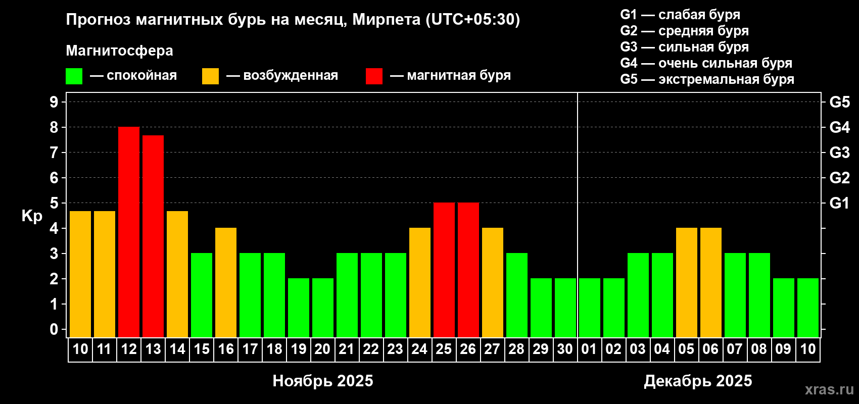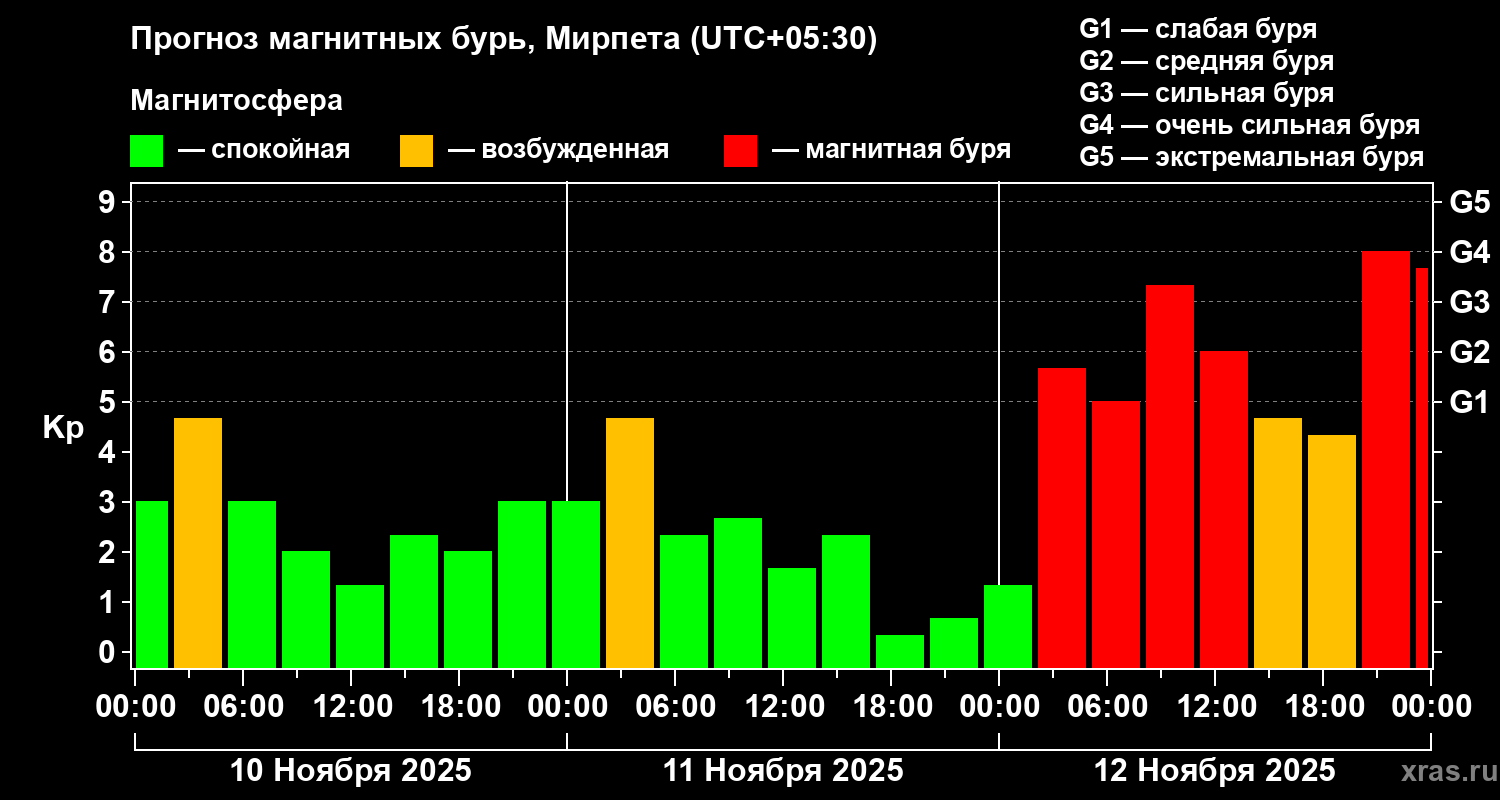 Прогноз магнитных бурь в Мирпете — 10 ноября 2025 года
