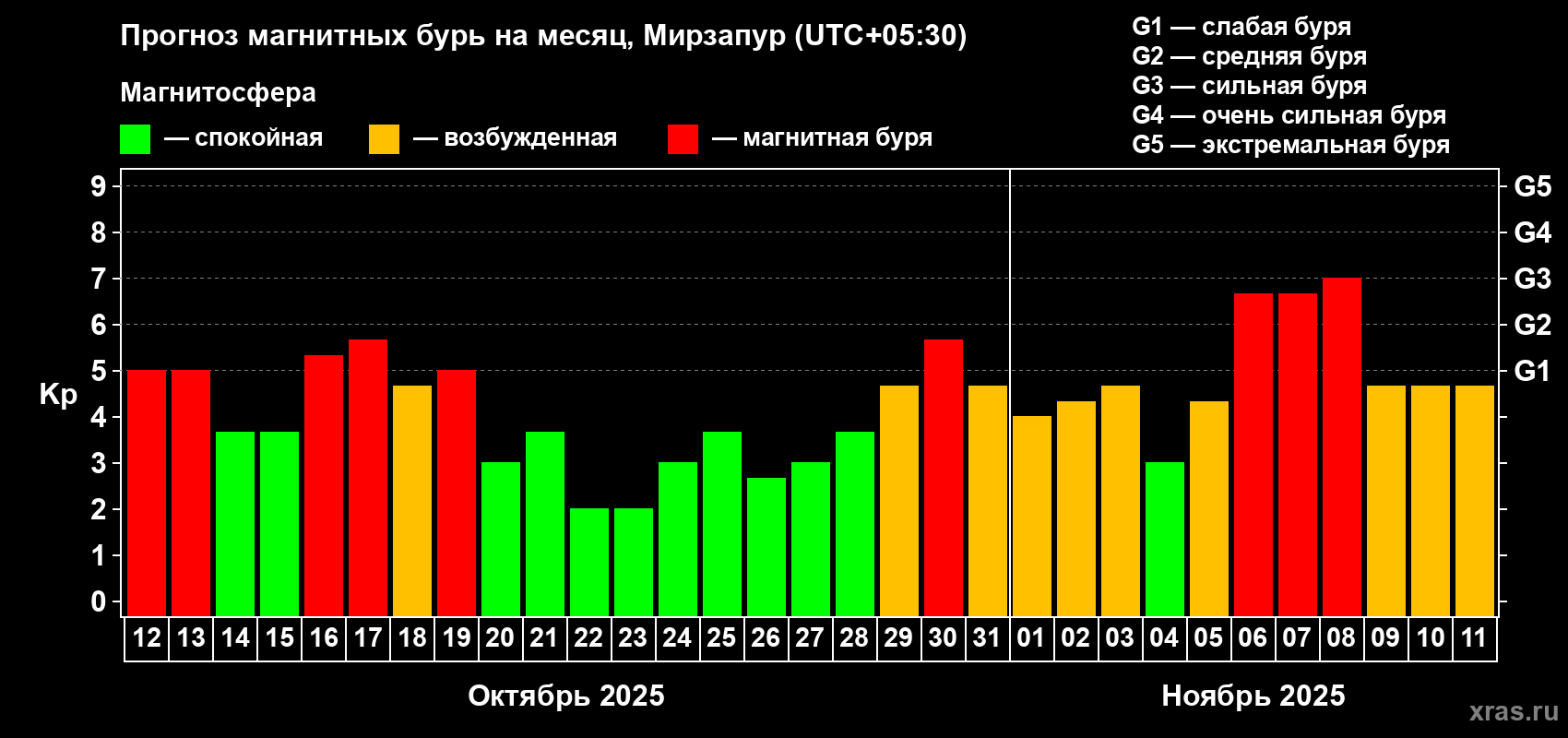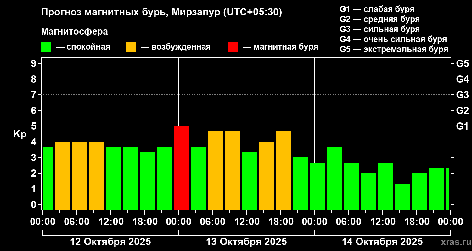 Прогноз магнитных бурь в Мирзапуре — 12 октября 2025 года