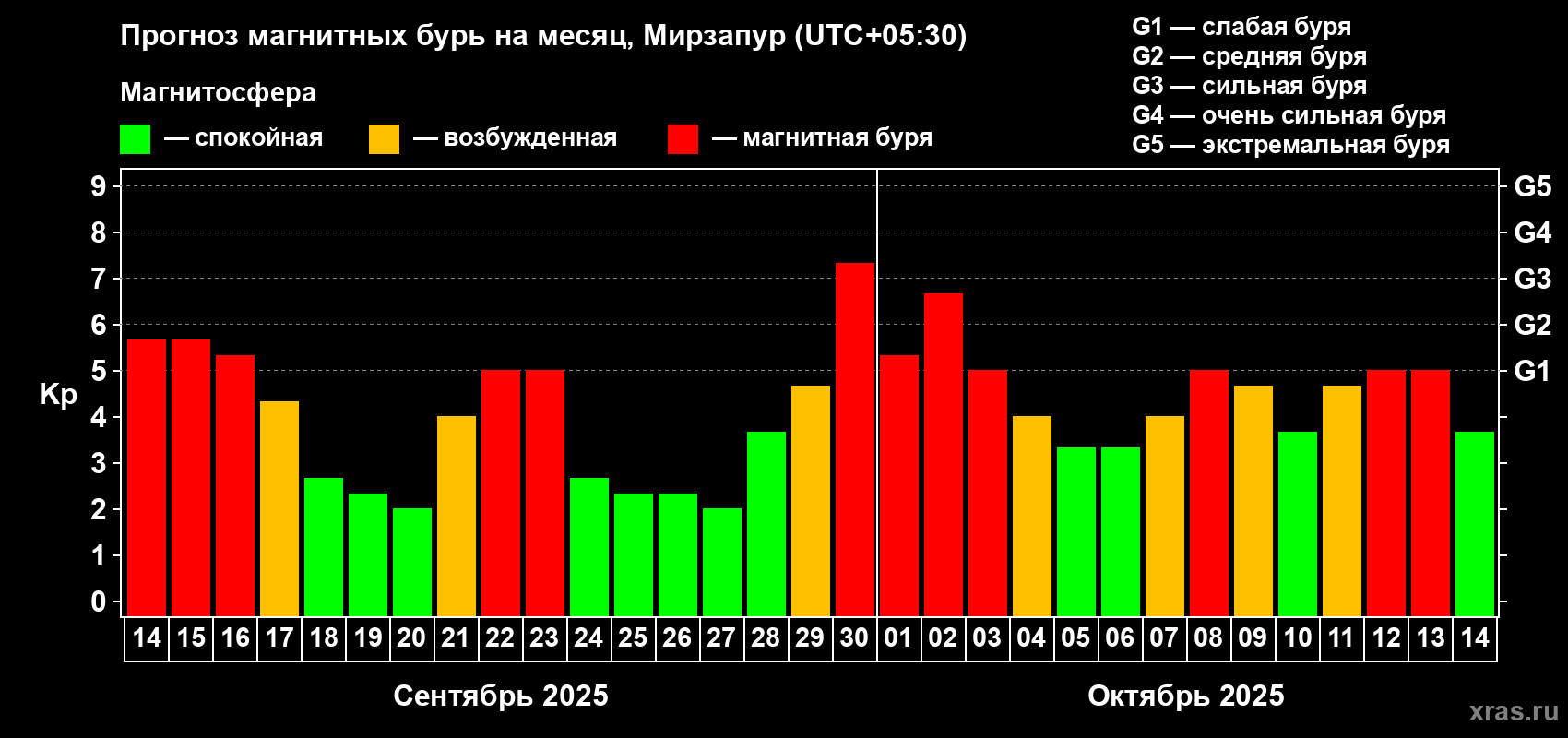Прогноз магнитных бурь в Мирзапуре — 14 сентября 2025 года