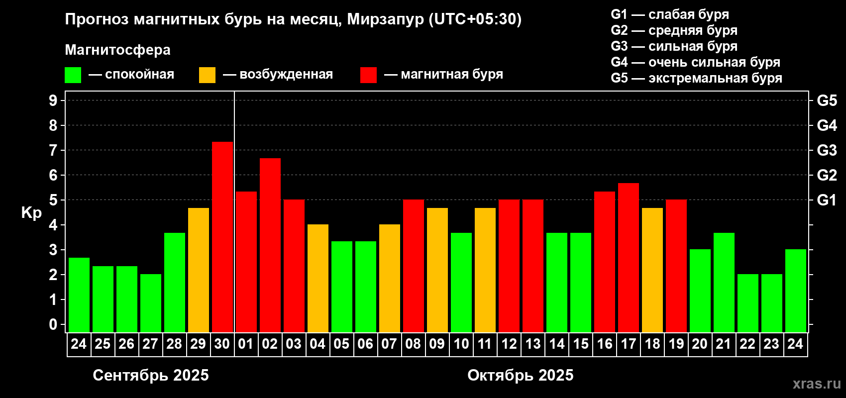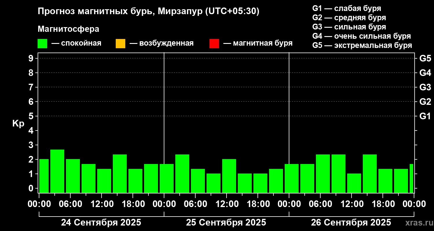 Прогноз магнитных бурь в Мирзапуре — 24 сентября 2025 года