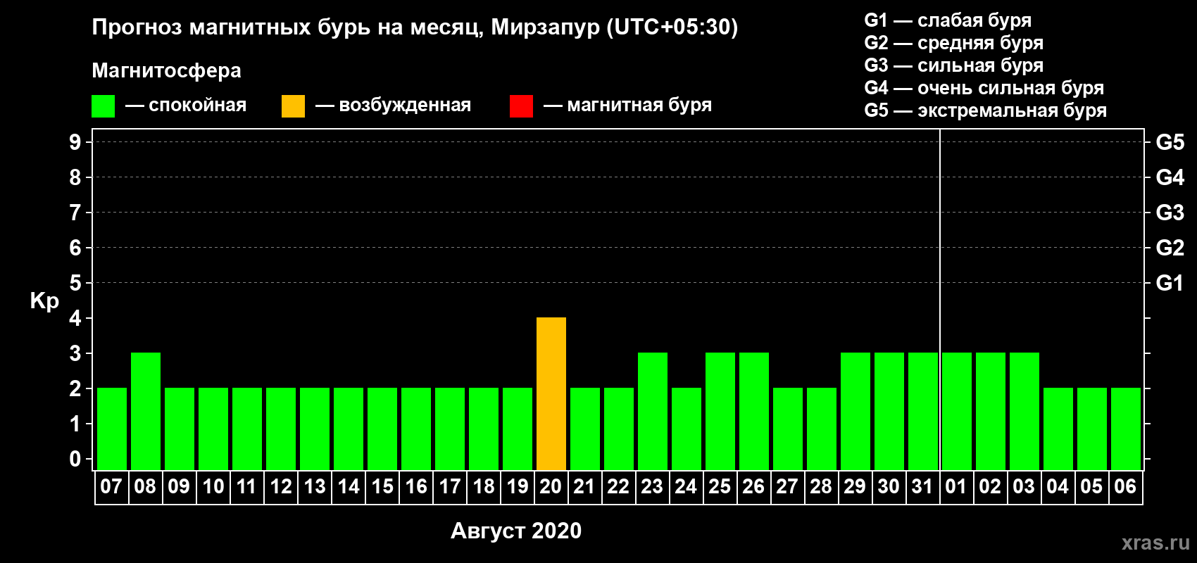 Прогноз магнитных бурь в Мирзапуре — 7 августа 2020 года