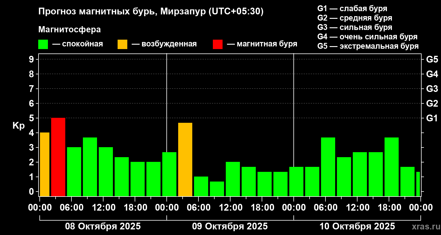 Прогноз магнитных бурь в Мирзапуре — 8 октября 2025 года