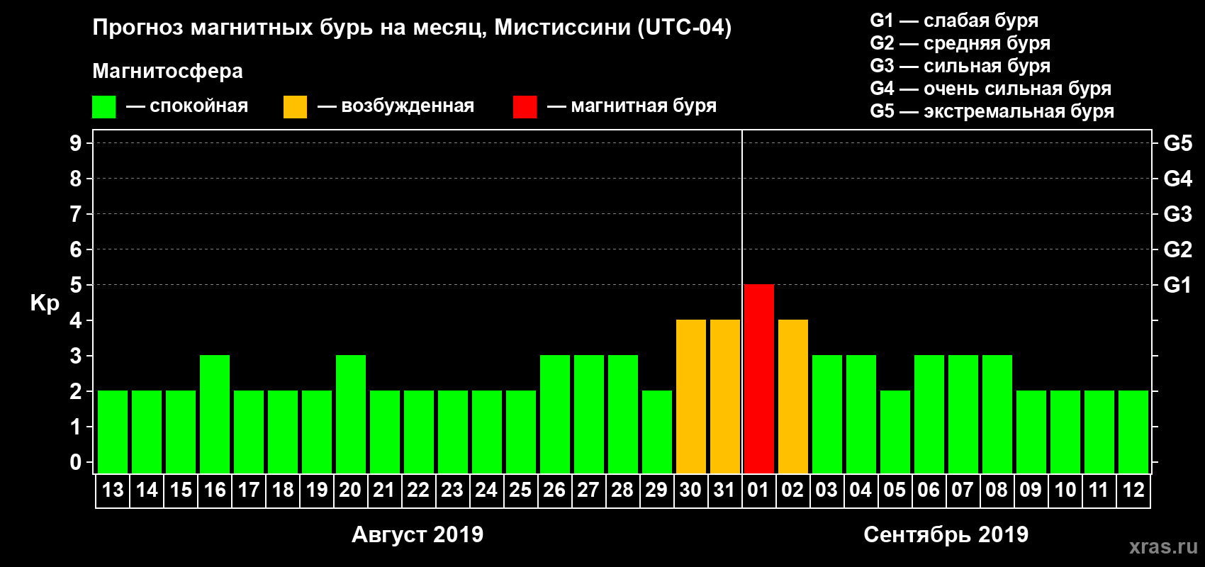 Прогноз магнитных бурь Мистиссини на 13 августа 2019 года