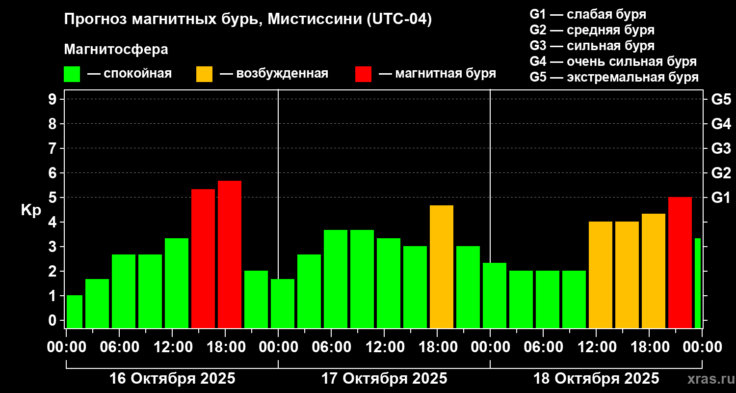 Прогноз магнитных бурь Мистиссини на 16 октября 2025 года