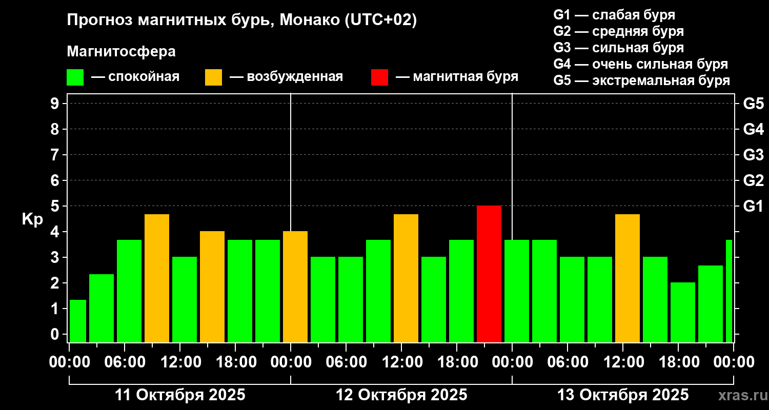 Прогноз магнитных бурь Монако — 11 октября 2025 года
