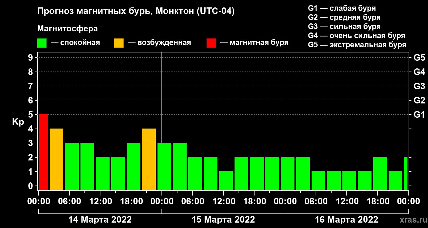 Прогноз магнитных бурь в Монктоне на 14 марта 2022 года