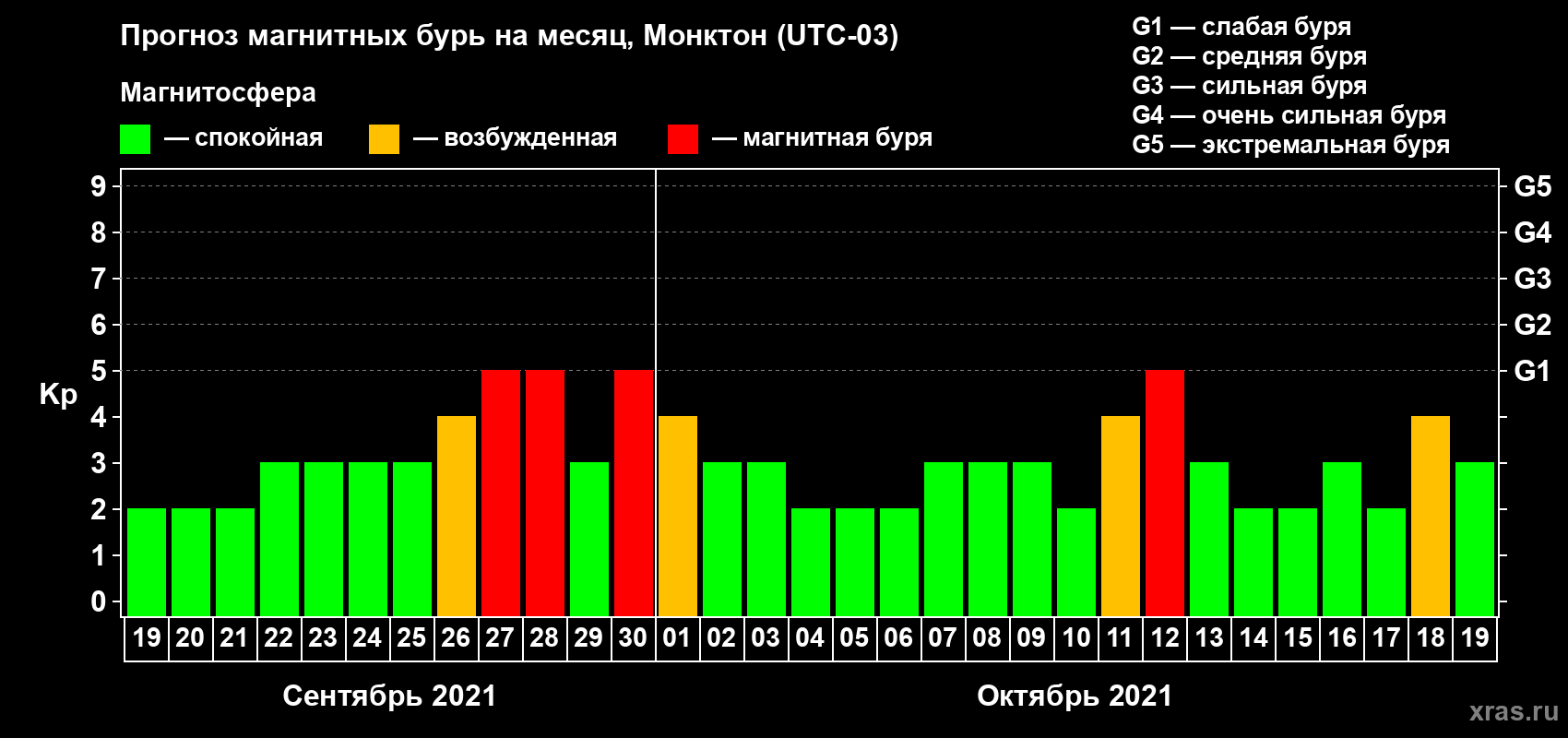 Прогноз магнитных бурь в Монктоне — 19 сентября 2021 года
