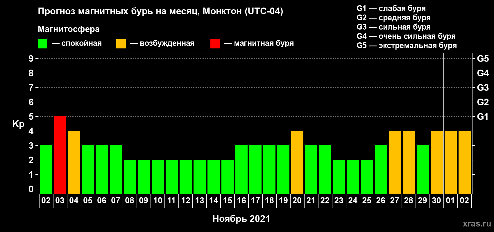Прогноз магнитных бурь в Монктоне — 2 ноября 2021 года