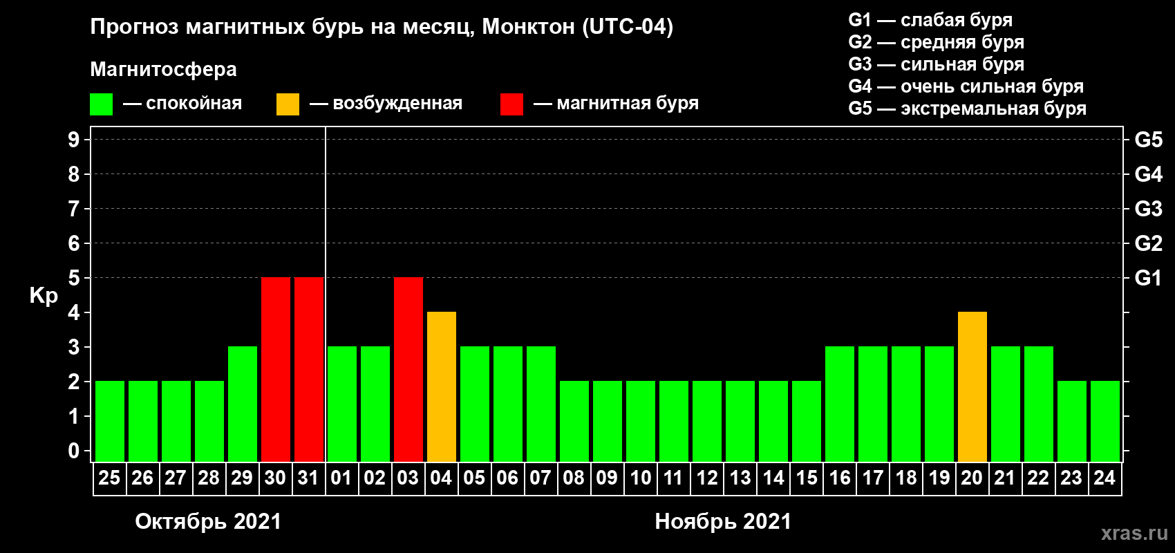 Прогноз магнитных бурь в Монктоне — 25 октября 2021 года
