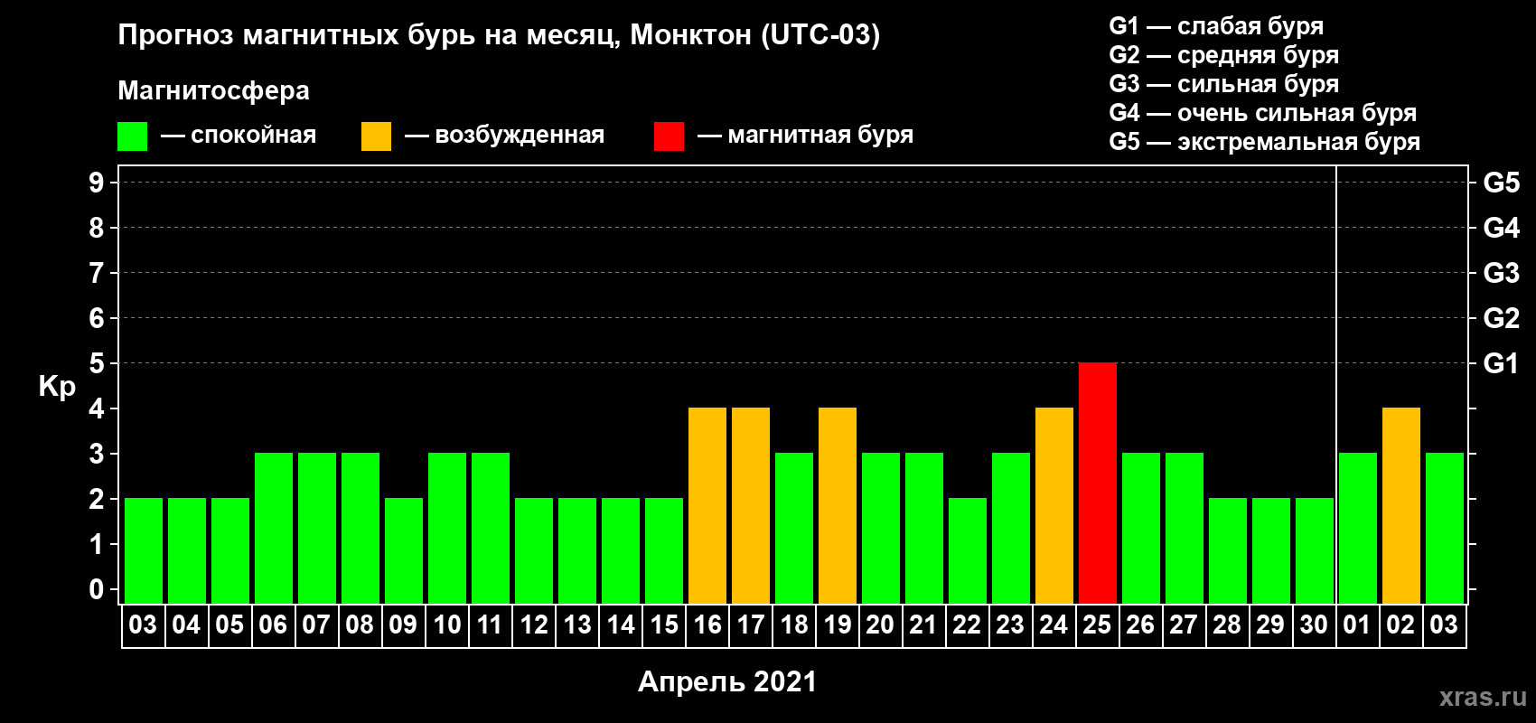 Прогноз магнитных бурь в Монктоне — 3 апреля 2021 года