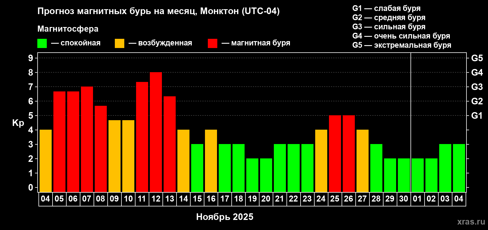 Прогноз магнитных бурь в Монктоне — 4 ноября 2025 года