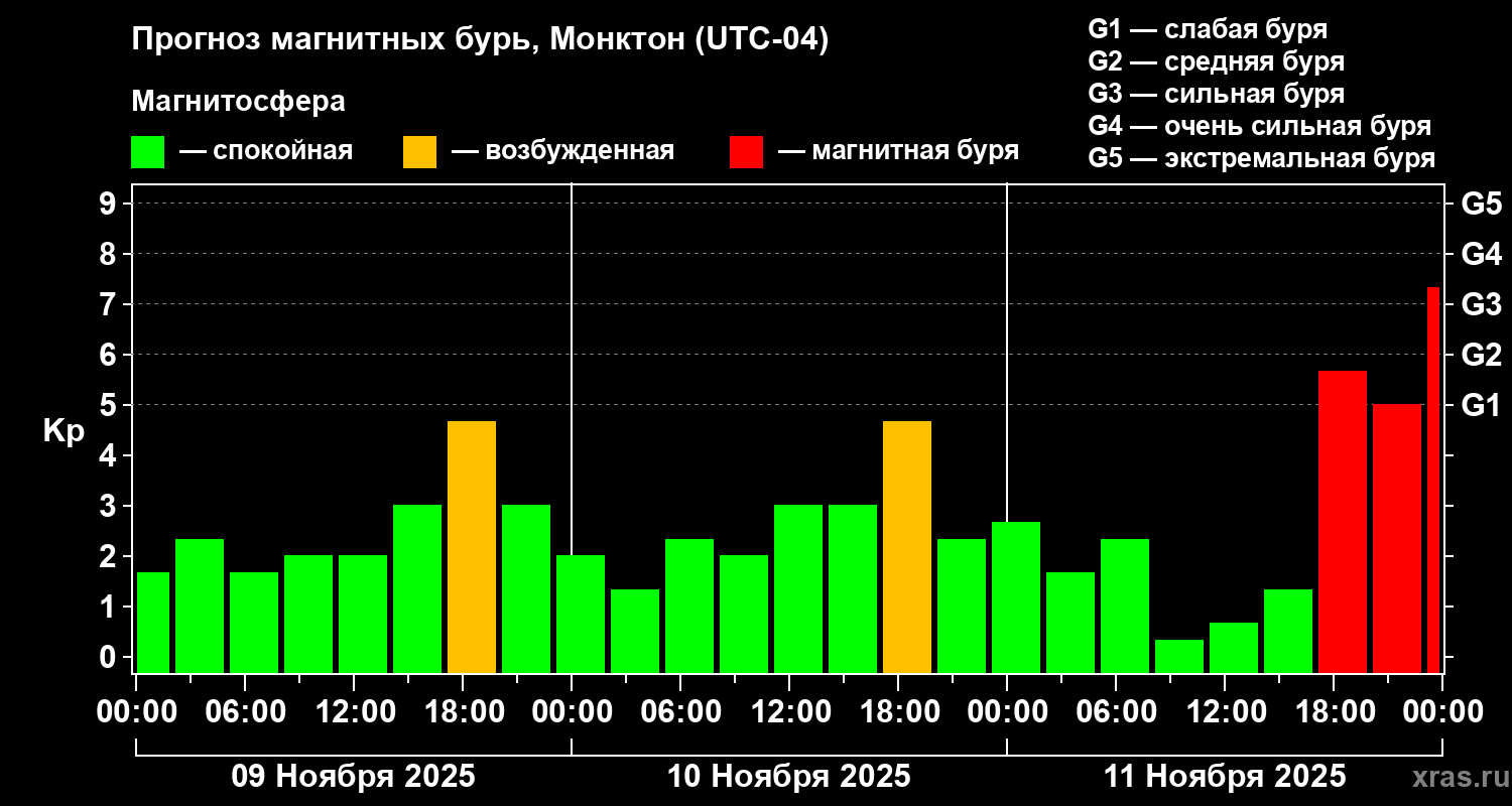 Прогноз магнитных бурь в Монктоне — 9 ноября 2025 года