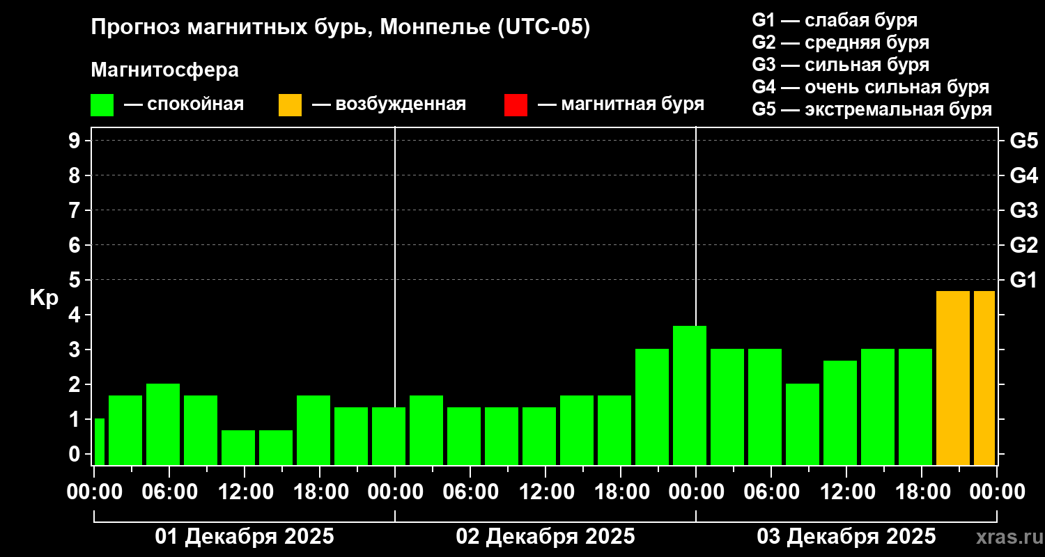 Прогноз магнитных бурь в Монпелье — 1 декабря 2025 года