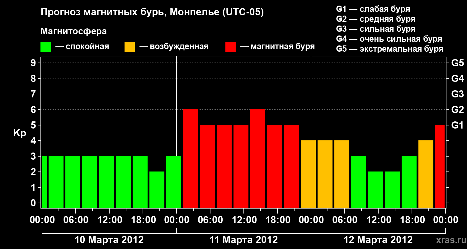 Прогноз магнитных бурь в Монпелье — 10 марта 2012 года