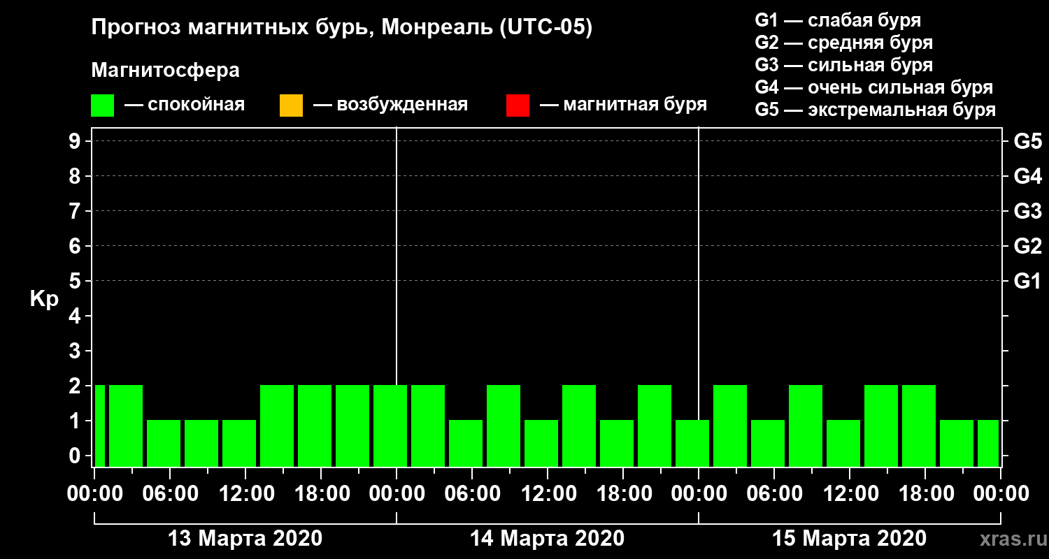 Прогноз магнитных бурь в Монреале — 13 марта 2020 года