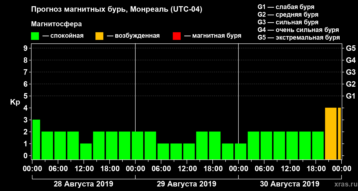 Прогноз магнитных бурь в Монреале на 28 августа 2019 года