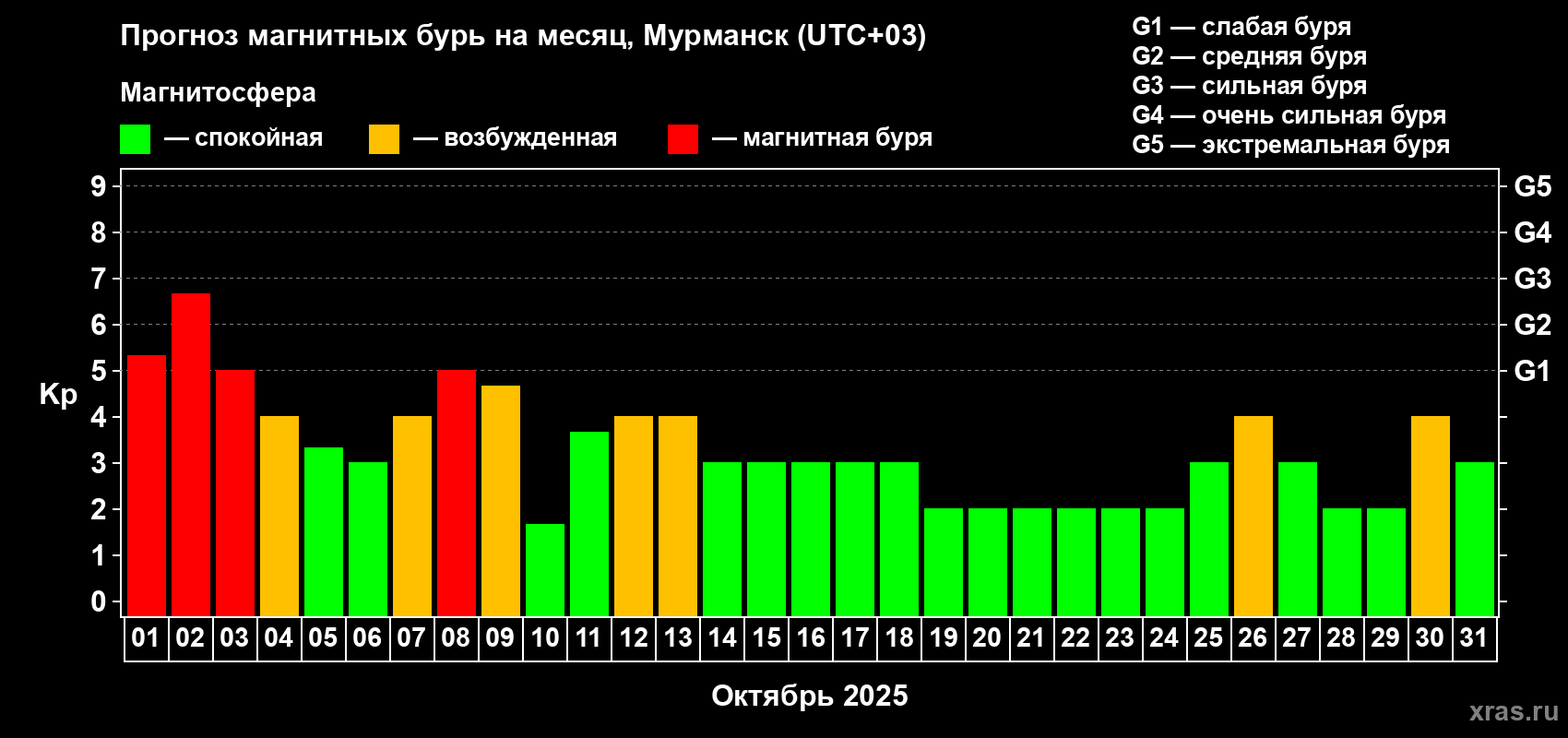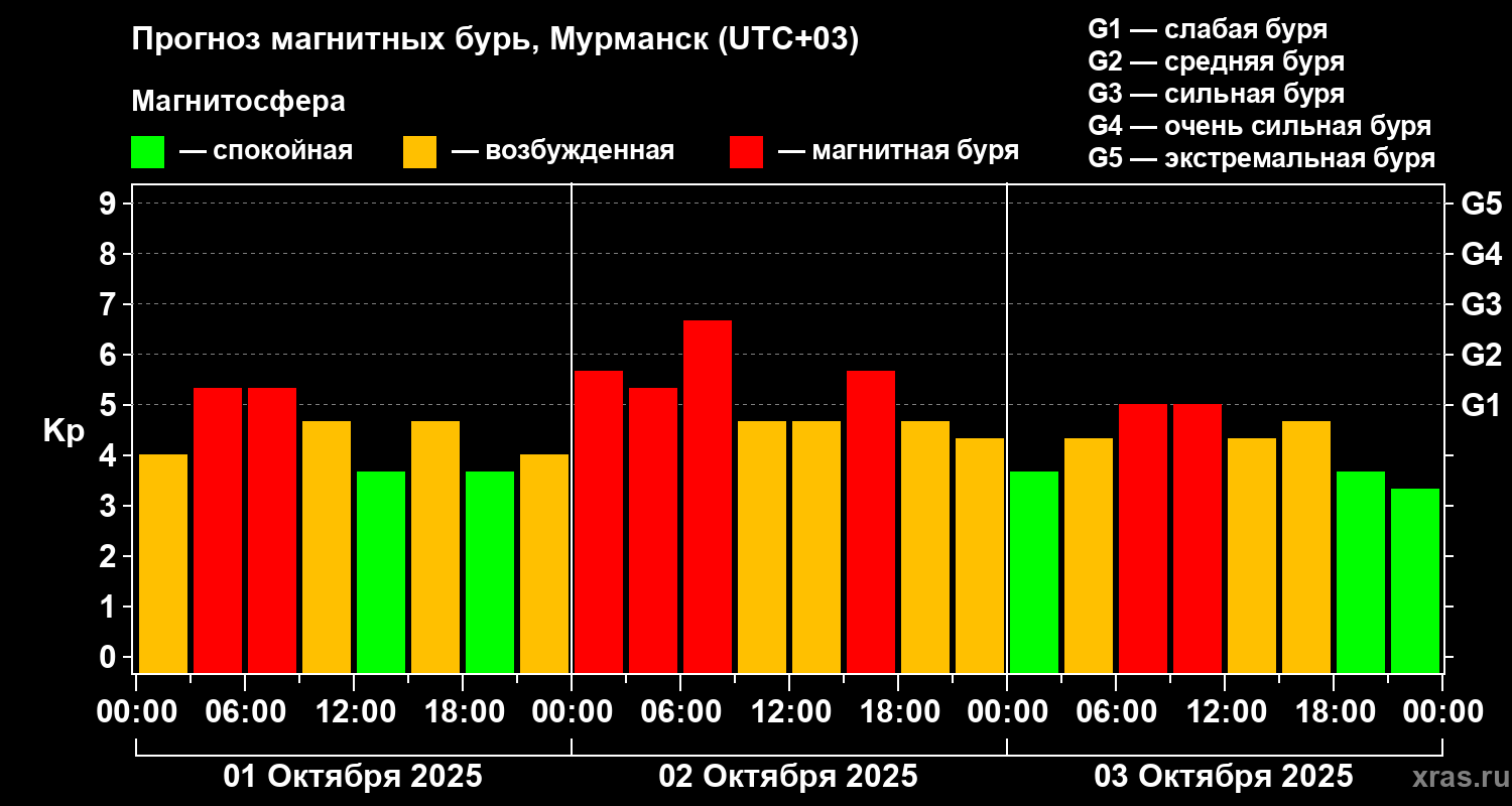 Прогноз магнитных бурь в Мурманске на 1 октября 2025 года